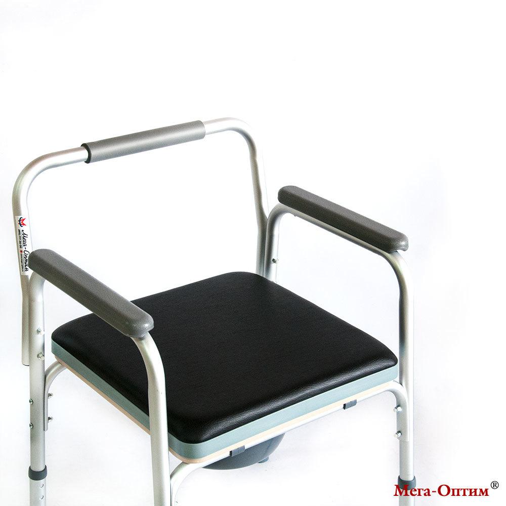 Стульчак выполнен из прочного, легко моющегося пластика и оборудован санитарной емкостью с крышкой. Емкость удобно переносится за ручку. Рама выполнена из анодированного алюминия и не подвергается коррозии. Кресло регулируется по высоте с помощью кнопочных фиксаторов на ножках конструкции (5 положений регулировки с шагом в 2,5 см). Ножки кресла оснащены противоскользящими наконечниками, не оставляющими следов на полу.