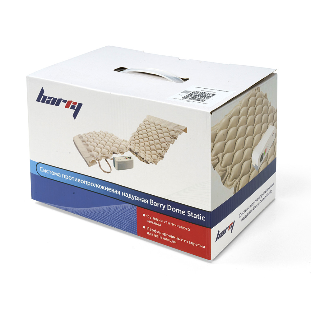 Barry Dome Static представляет собой ячеистый противопролежневый матрас, рекомендованный для профилактики и терапии пролежней начальной и средней степени тяжести. Благодаря своей простоте в использовании, система подходит как для домашнего ухода, так и для применения в медицинских учреждениях. В комплект входит матрас и компрессор. Продолжительность одного рабочего цикла составляет 12 минут, а время полного надувания — не более 30 минут.