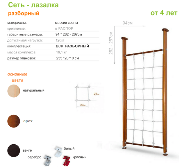 С установкой гладиаторской сетки справится любой Она крепится в распор между полом и потолком, создавая прочное соединение. Её компактная конструкция и стильный дизайн, позволят ей гармонично вписаться даже в самый строгий интерьер, не заняв при этом слишком много сводного пространства. Каждый элемент этого спортивного инвентаря разработан с учетом потребностей и возможностей маленьких спортсменов, а так же их родителей. Благодаря использованию прочной древесины сосны, стенка способна выдержать серьезные нагрузки.